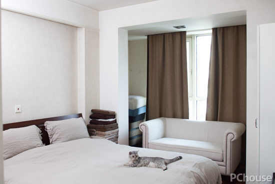 两人的卧室采用同样的墙面装修,与木色的睡床、咖啡色的窗帘和白色的床品,搭配起来显得冷清又沉闷;卧室是休息的地方不适合采用太多鲜艳的颜色,香芋色配合浅灰色,让空间既有不一样的氛围又不影响舒适的休息。