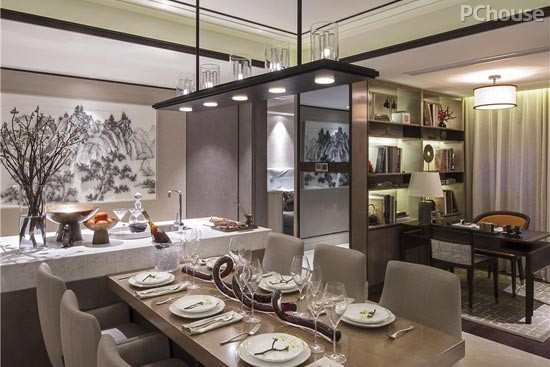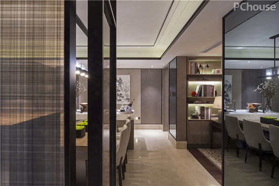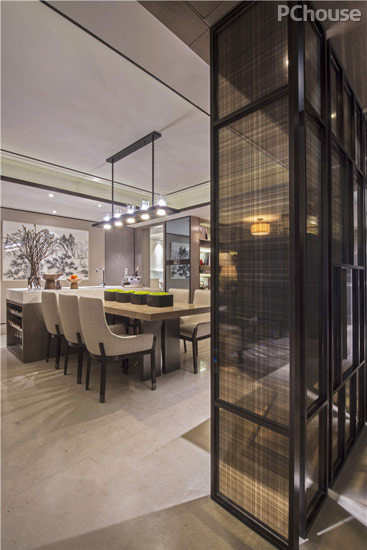 编辑点评:格栅式屏风,低调而沉稳,为空间增添了一丝别致的优雅。隔断中的镜面材质,让空间的呈现有了回转的余地,达到虚实相映的效果。餐厅空间,自远处望过去,意境美更加深邃。
