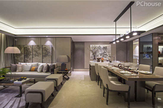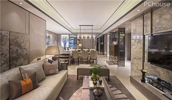 编辑点评:开放而又对称的平面布局和立面构图,让空间有着一气呵成的连贯和轻奢气派,同时也透露着现代中式特有的禅意和素雅。多样的材质运用,赋予空间丰富灵动的表情,让公域更有视觉深度。