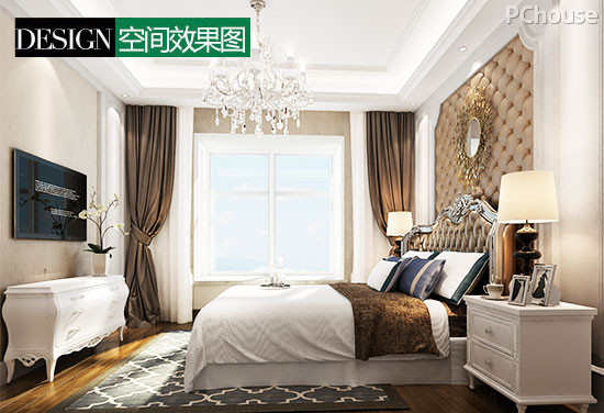 设计解读:不同于客厅空间的多色碰撞,主卧整体以暖色调为主,木质地板的铺贴设计,搭配写意花纹地毯平铺,质地柔美亲和,极具自然触感。欧式吊灯修饰其间,空间华美而不繁琐,装饰质感提升空间情调。