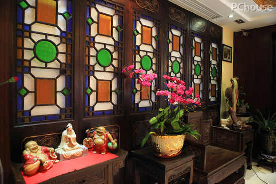 瞧那侧旁的株粉面桃花、相谈甚欢的笑佛,背靠多宝格雕花窗饰,倚坐在这复古的红木椅子上,静静的叹杯茶,聊聊天,想必也是一种享受。