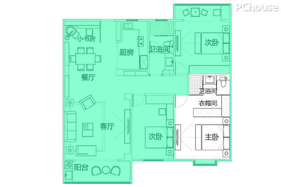 2.客餐厅呈狭长状,完全联通,并没有让空间得到充分的利用;