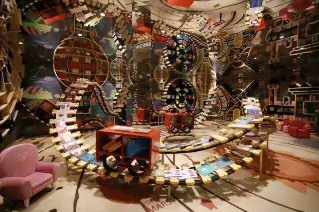 ▲ 钟书阁杭州店最富想象力的就是童书区域。一个超过200平方米的童书馆,主题是书籍游乐场,极具童话色彩。旋转木马、过山车、热气球和海盗船等,这些既是装饰,也是特制的书架,童趣十足。脚下的地板藏有玄机,是用星系图绘制而成的,如果带孩子去的话,可以和孩子一起找一找这些星系知识。