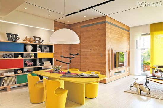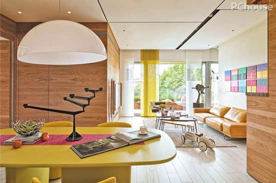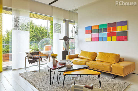 编辑点评:从室外的葱郁树丛延伸到室内的空间,会发现一切是如此地和谐、自然。设计师大面积地运用黄色作为软装布置的基调,以此营造一个简约宁静的室内环境。墙面上饱和度各异的彩色拼块起到了很好的平衡作用,让空间朝气活泼却不繁杂。