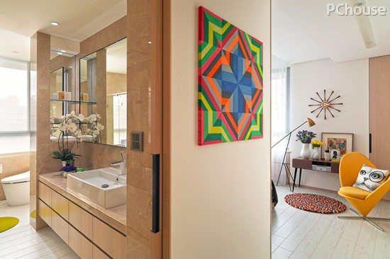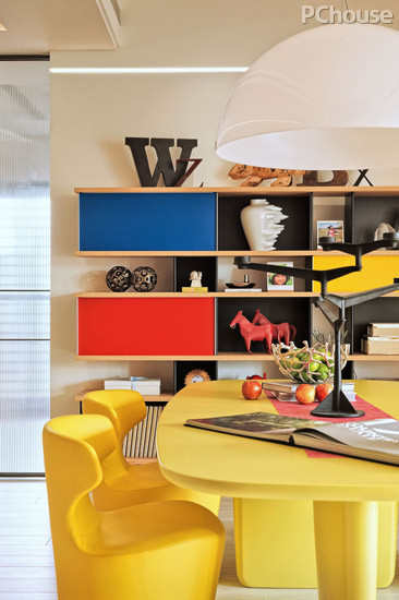 编辑点评:在活力而明亮的红、蓝、黄色调中中,是各式陈设艺术品的穿插。设计师借助文化的符号打造了一个气质而内涵的人文空间,丰富了段落间的变化。