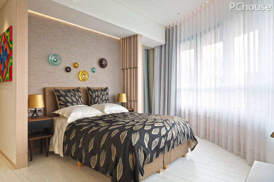 编辑点评:简化后的造型线条、材质与立面的层次转换,让空间透露着典雅的气质。厚重沉稳的丝光黑色羽饰床品在自然的日光中更显质感与高贵。