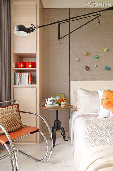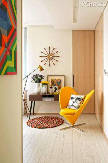 编辑点评:以木质与米色为基调的主卧,有着极简的家装线条,整体轻薄流畅。亮黄的单椅和彩色的软装陈设是空间的点缀,赋予了空间更多的活力,让利落时尚成为了空间给人的第一印象。