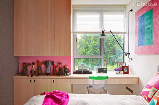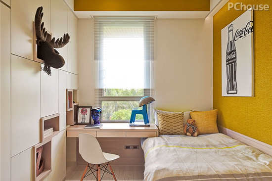 编辑点评:颜色上恰到好处的点缀与呼应,让整个儿童房活力而不会过于浮躁;集收纳和陈设为一体的嵌入式衣柜,让空间机能发挥到极致,保证了空间的舒适性与条理性。