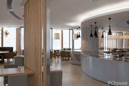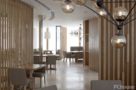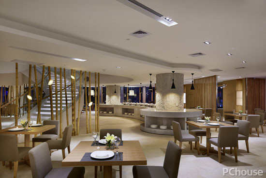 编辑点评:西餐厅的色彩组合汲取了大自然的造物灵感,让整个“自然海洋”的主题风格更加形象化;温润的木质与布艺,在光影下显得更加清新怡人,干净而且舒适。