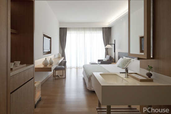 编辑点评:酒店的客房面积非常小,设计师也相应采用了开敞式的设计,巧妙地利用光影效果,尽量放大其对空间扩张的作用,使房间的通透感更强,而无狭窄压抑之感。