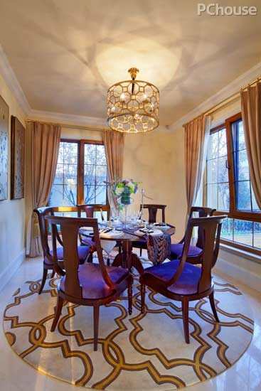 编辑点评:餐厅放置圆形餐桌,设计以黄色、深咖及哑金为主色调,以紫色及木作为点缀,加上少量金属质感的介入,提升了整个空间气质。风格化的铜质吊灯与地毯交相辉映,实木餐桌与紫色绒面餐椅完美融合,制作出主人日常精致的生活场景,独具匠心。