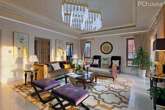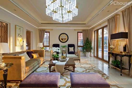 编辑点评:一层为敞阔的英式会客厅,客厅宽达2米的巨型水晶吊灯,宽大的沙发和几案,随处安放的欧式风格摆件、挂画,墙面装饰镜经过色彩和线条处理后,与经典的拼花地毯相呼应,英式的优雅与精致在所有的细节上的用心显得更加到位,气韵自然流转。