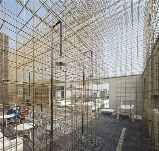 人们将在屋顶的露台结束这段空间的旅程,自由延展的黄铜网格天篷将周围的城市景观框定成为空间的一部分,营造极致的视觉体验。