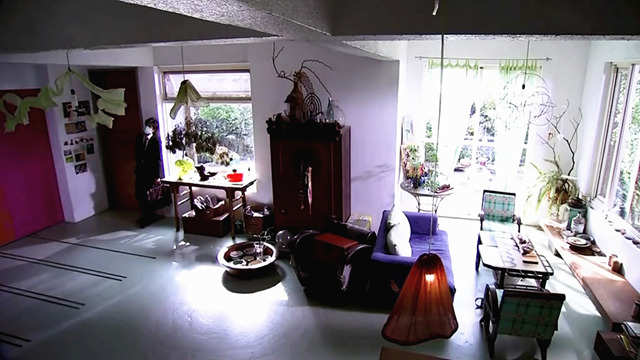 拐角角落里放了一个类似煤炉的东西,干树枝充当起撑物架,复古又精致的手提包和鸟笼挂在一起。同时,我们不难发现客厅里还摆放了很多奇形怪状的彩色花瓶,里面盛满花草,几乎占据了所有的壁柜木台,与窗外的绿树相连成画。