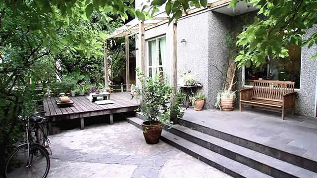 庭院主要由木制长椅、茶桌,一辆单车(可能是摆设)和很多的花草树木组成,当然主角就是一眼就看到的木板露台。打开客厅的落地窗就可以直接通往这个露台,非常方便。几根木柱子撑起了透明遮雨棚,晴雨两不误。这里仿佛世外桃源,不受人间琐事纷扰,休闲又写意。
