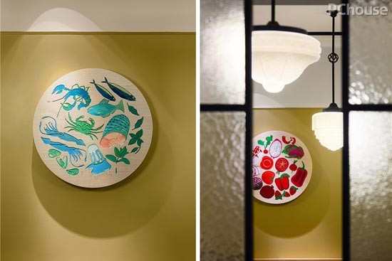 编辑点评:餐厅壁面上色彩缤纷的装饰品有着各种趣味的图案素材:虾子、鱼、番茄、青椒、三明治、汉保、奶昔杯等,传达具有丰富多样的料理概念,并散播欢乐愉快的用餐氛围。
