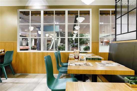 编辑点评:另一面的端景是以木作汉堡造型的大logo加上大自然的水绿色墙面搭配而成,营造出清新欢愉而又舒适的用餐气氛。