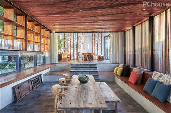 编辑点评:大厅的一侧是书屋空间,因着用途的不同,同一空间被划分为两个功能区。而且,在设计上更是别出心裁,与平地式的大厅不同,书屋空间则承接混凝土结构,被设计为下沉式的开放空间,在这里可以满足阅读与休闲放松的使用需求。家具陈设多采用当地拆除的老木房梁改造制成,散发出淡淡的时光印记感,令人身心愉悦轻松。