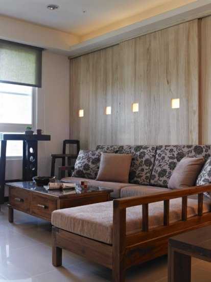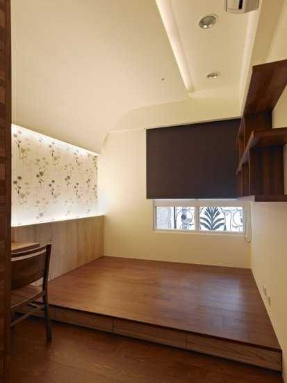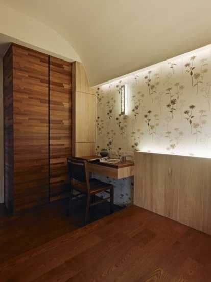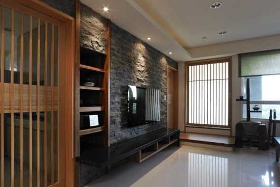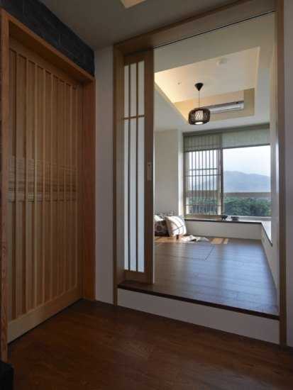 透过自然为导向的媒材,如实木、石材,透过对外窗的连结,将户外优美景况纳入,共同呼应出悠閒为主题的生活况味。客厅主牆透过石材粗犷触感的表现,增加自然意趣,于沙发旁的对外窗前,规划原木桌椅,铺述舒适悠閒的休憩质塑。和室空间利用架高木质地板、格栅推拉门扉、格栅语彙为主的推窗,挹注浓郁的日式精神,透过L型对外窗,揽入满室阳光与优美景致。餐厅位于客厅一旁,以开放方式规划,视觉可以穿越客厅,饱览室外自然环境,强调悠閒氛围。主卧空间以实木格栅做为区域介面,引申更丰沛的光源进入更衣室。