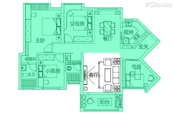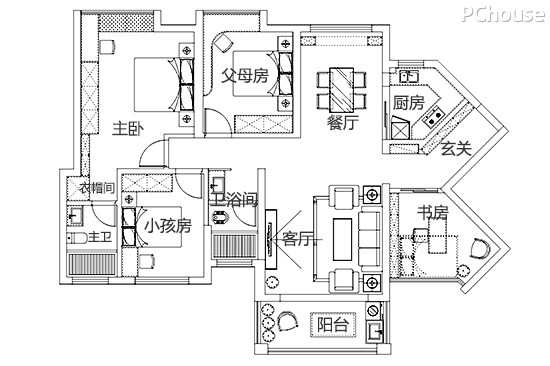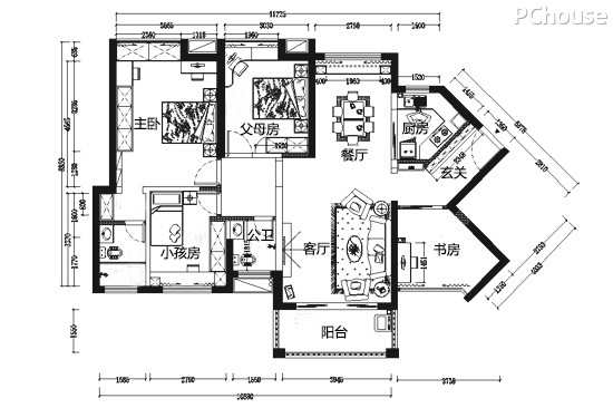PChouse编辑点评:本期户型设计,以现代中式风格为主,设计师用简约的线条构筑了与众不同的空间表情,使看似简单平静的现代简约装饰,蕴藏着典型的中式风格。不仅满足了业主一家人追求简单生活的居住要求,也迎和了现代中式家居追求内敛、质朴的设计风格。