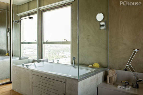 编辑点评:以天然木材铺砌地板、灰色大理石中包裹的白色浴缸、透明的玻璃挡板以及明朗的开窗设计,让人有着置身大型浴场的错觉,宽敞而且舒适。