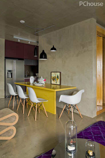 编辑点评:以灰色作为背景主色的厨房空间内,灶台上方的橱柜有着暗紫色的柜身和鲜黄色的柜顶;在餐桌和食材准备区上,涉及谁同样选用鲜黄色的台面,以明亮的色彩活跃室内的气氛。