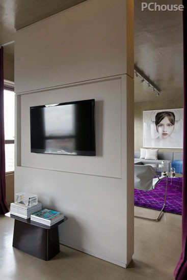 编辑点评:整个阁楼公寓的装潢,包括地板、墙面和天花板均以“焦质水泥”材料为主,在紫色地毯和亮眼的艺术人物挂画的映衬下,更显质感,有着现代风情的干净与优雅。