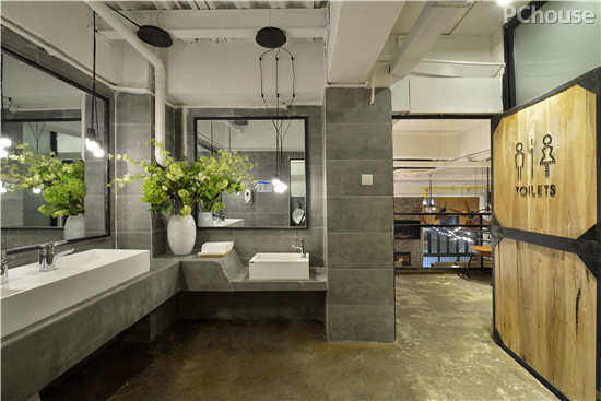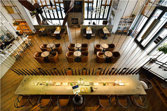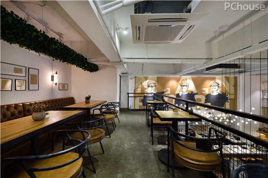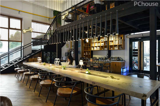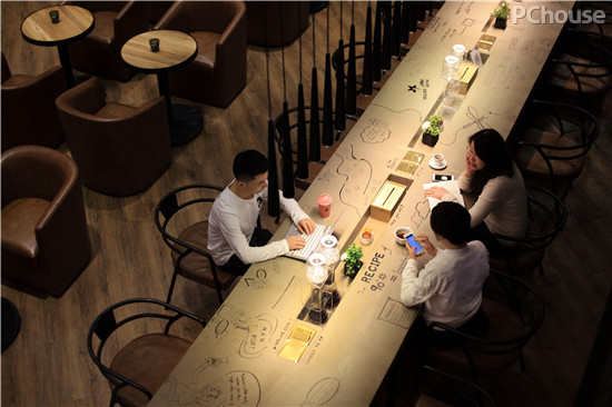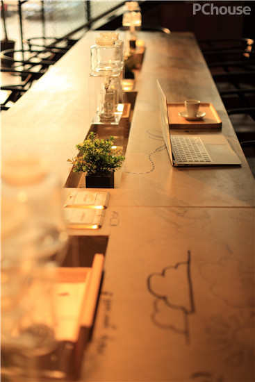 虽然是工业风设计,但是在营造咖啡馆氛围的时候,还是注入了不少温馨元素:例如木桌旁小水管下暖黄色的灯光,长桌上可爱的卡通图案,沙发旁温暖的真火壁炉。慵懒的午后,坐在这里,听着喜欢的音乐,喝上一口咖啡,是何等享受。
