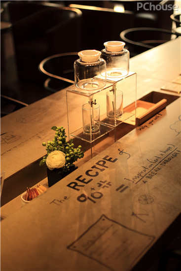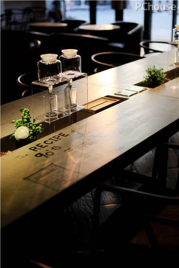 整个咖啡馆的东面,利用店内唯一的一个完整的实墙面,前面做成了一整排开阔的、功能强劲并气势庞大的吧台区。而后墙面除了在正常可取用的高度下做成层板以收纳咖啡馆的餐具及日常用品, 以上高度,设计成了大幅的、极具张力的广告画,确保能够第一时间抓住由西面大门进入咖啡馆的顾客的眼球。