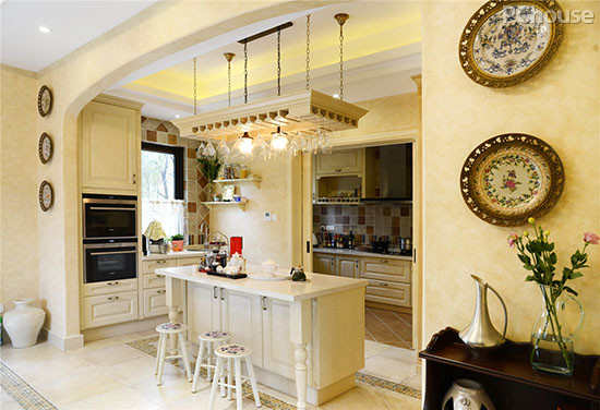 编辑点评:以白色为基调的中岛设计,有着美式风格的质感;搭配造型感很强的酒杯吊顶和灯光设计,空间的整体显得更加丰盈舒适。