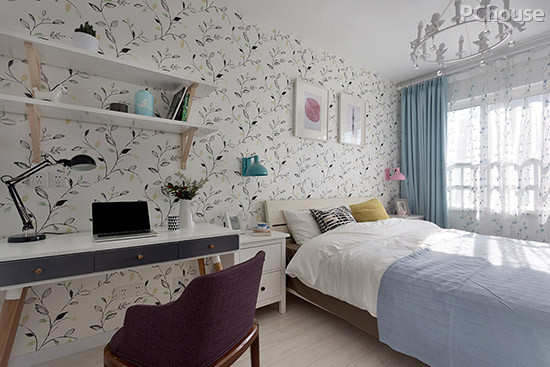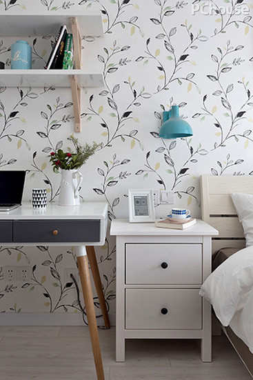 编辑点评:进入卧室,给人的第一感觉是清新又甜蜜的自然风情。卷草的墙纸搭配纯色的床单和窗帘,营造了一个舒适静谧的休憩氛围。