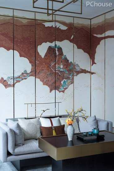 编辑点评:墙面的装饰上,有别于以往的形式,设计师别出心裁地把画作为背景,并结合著名国画大师张大千的山水画和现代琉璃材质,实现了更时尚的东方美学及文化氛围。