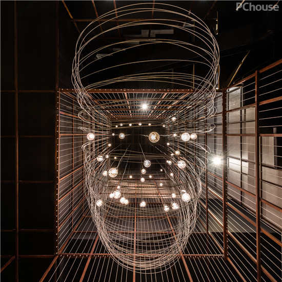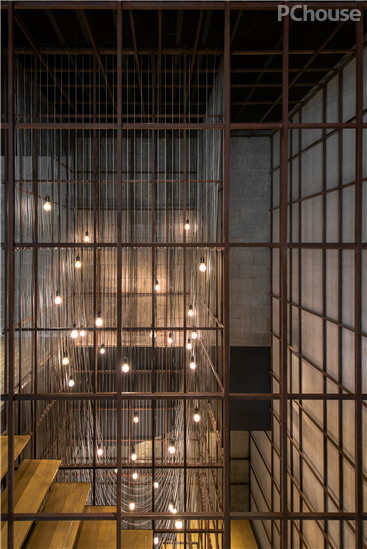 铁架由一层继续向上延伸,沿着嵌于其中的楼梯进入二层包房区。