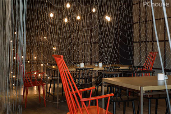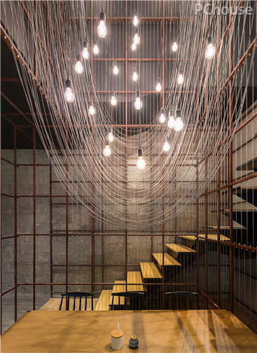 “钢丝面条”在这里经由重叠悬挂规限空间。这些可看穿的虚幕散发着空灵飘渺的气质,令面馆独一无二。