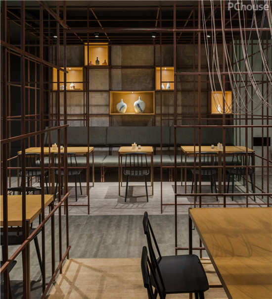 裸露的原始墙面,锈铁框架,木质桌椅与壁龛,设计师运用统一的材质和元素营造了三个不同的空间。