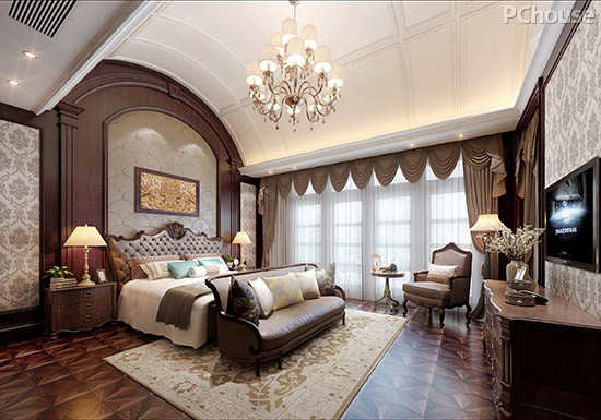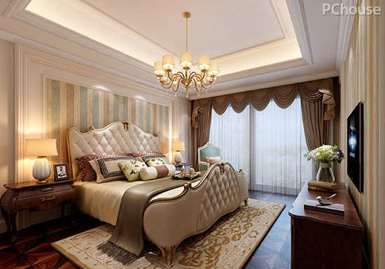 设计说明:沿袭古典欧式风格设计,在次卧空间里使用简单的线条手法,通过硬装的层次吊顶,与软装的床头背景墙互相辉映,简洁的家具利落有致,整体色调与突显长辈的沉稳性格。