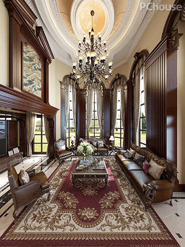 设计说明:从夹层俯瞰看客厅,古典吊灯成了视觉的焦点,落地窗的宏伟气势直冲客厅正中部,华贵与温馨并重的意味油生。