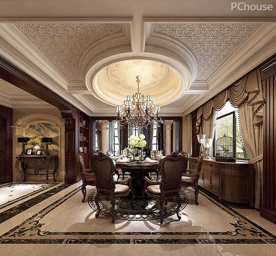 设计说明:经由细致的雕琢,挑空吊顶流露独特的浪漫情怀,与位于正中的华贵吊灯相映生辉。