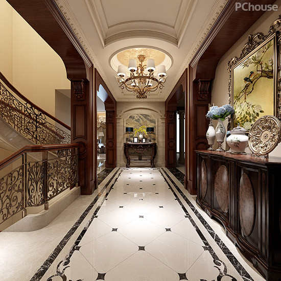 设计说明:门厅中质感突出的风格化家具与气势流涌的实木装饰将空间华美而庄重的设计主题进行升华,愈显温馨的空间色彩则将为业主呈现非同一般的居住环境。
