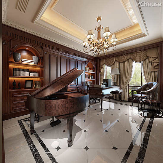 设计说明:设计师准确把握业主作为钢琴行业工作者的特征与需求,在一层敞开式书房当中摆置自动演奏的三角钢琴,将空间主人与众不同的个性和追求淋漓展现,通过令人回味的古典乐曲,装饰具有灵气和神韵的室内空间。