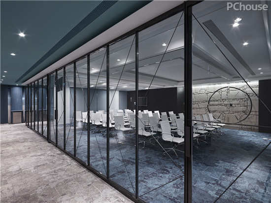 穿透性的铁件玻璃组成会议室的区隔,除营造出空间层次,亦丰富视觉的通透感,让空间和时间的存在穿透界线。会议空间的规划使用活动式隔屏创造不同场地的转换,在墙体开合间转化不同尺度的空间量体,可自由变化小型会议室到百人视听室的不同容纳需求,创造更为善用的智能性空间。