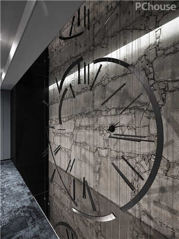 "Time is Money",除映照出企业形象与宗旨,我们更将时钟解构重组,使用不锈钢材质搭配,创造工业时代经济快速发展的时间流动。背墙则以不经刻意的仿旧石材创造中世纪堡垒材质,结合古今元素,间接扣合起「时间」的主轴。