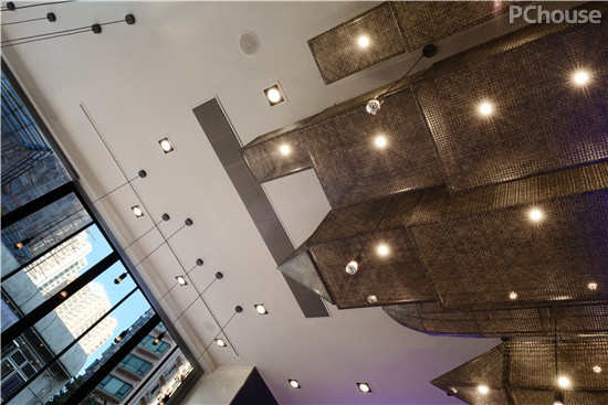面向厨房的位置有一个生动的霓虹装置 - 火苗由一小片开始,越烧越旺,然后在发亮的雨点碎片中消散。