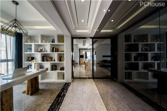 设计说明:书房与走廊的完美结合,浑然不知空间早已掠过眼前,从书房往外看,同样是一眼看穿的透视感,零隔断空间让你的视觉毫无阻挡。