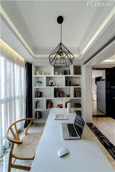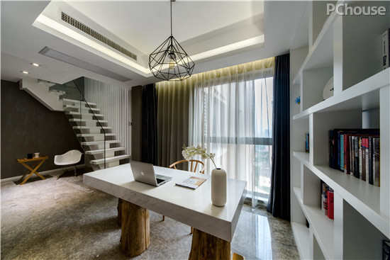 设计说明:书房背对落地窗,透出清晰淡雅的光。对于设计师来说,光是最经济营造气氛的元素,也是最主要的工具,有了光可以感受空间,可以知道尺度,可以看到喜怒哀乐,更可以感受人性的原貌。