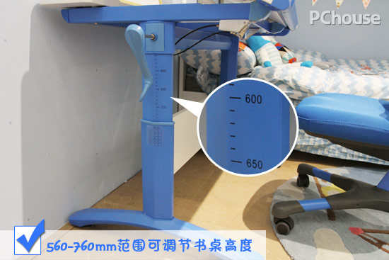 书桌高度调节十分简单,子龙也现场试了一下。通过书桌侧面的机械调节手柄,参考桌脚处的身高对照表,可以保证精准调节桌子高度,而且可拆卸的手柄也能防止孩子因为好动好玩,把桌子当成玩具经常调动。