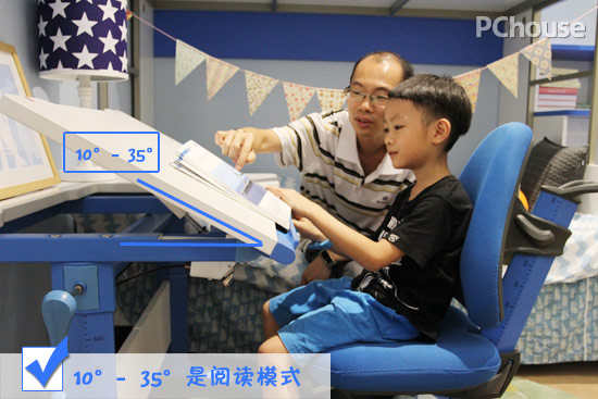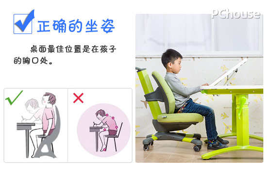 选择可调整高度的书桌,桌面最佳位置是在孩子的胸口处,在阅读架位置放置书籍,这样读书和写字时候孩子不用低着头,保护了颈椎的健康。
