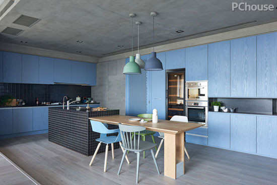 编辑点评:光影下,深浅不一的蓝色木板被大面积地运用餐厨区域中,与浅灰色的混凝土天花、地板相互协调;再加入黑白瓷砖和温润清新的家具灯饰作为点缀,给人的整体感觉十分清凉。