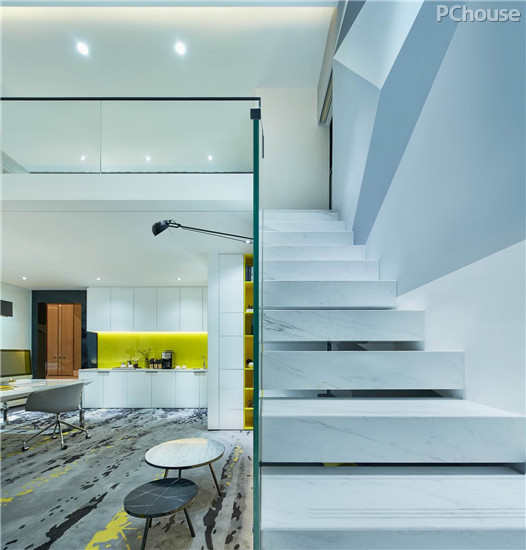 ▲设计亮点:悬挑的楼梯采用清玻护栏的做法,既保证安全性也在视觉上放大空间,减少空间的逼仄感。