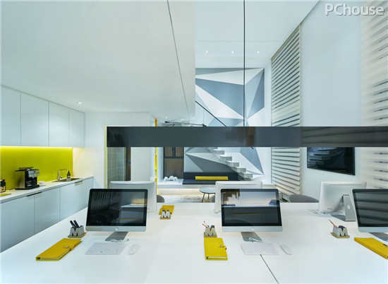 ▲设计亮点:虽然建筑面积就136平方米,但其实每一层仅有60多平方米,这相当于二居小户型的概念,能放下的办公道具非常有限,这里一进门就能看见一排不带间隔的矩形桌面。